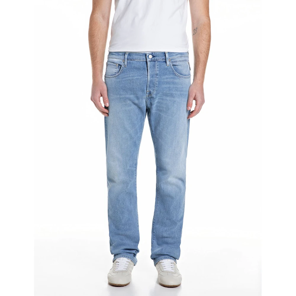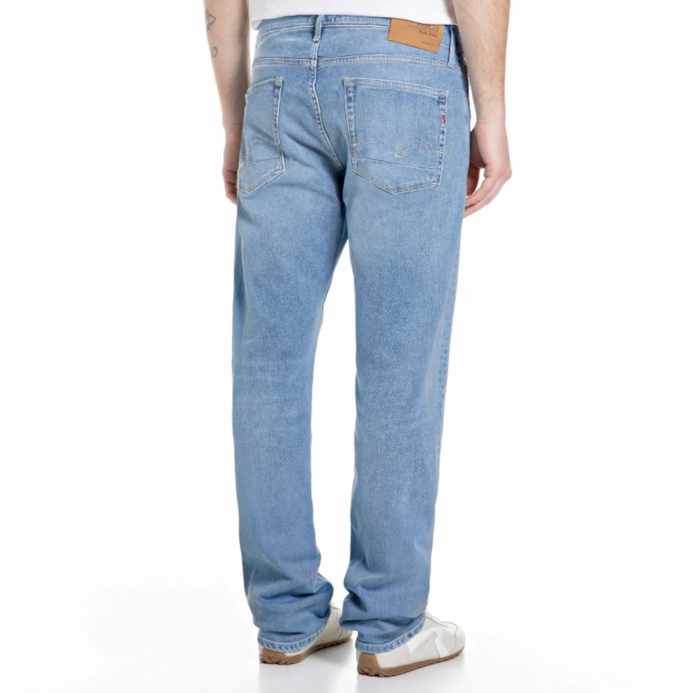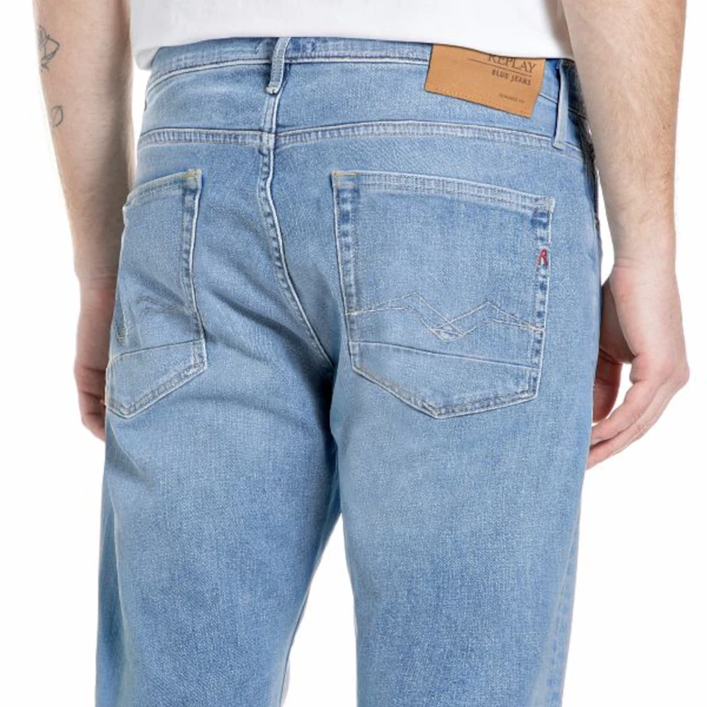 Straight-fit jeans with a regular-rise waist and a straight leg for a comfortable fit. This piece comes in light blue indigostretch cotton denim with a light enzyme wash and a final hang dry. The five-pocket garment also features hand-made whiskering and scraping that create additional colour contrast on the wear areas. Replay iconic gull-wing stitching decorates the back pockets, one of which is also embroidered with the letter R, a hallmark Replay detail. Zip and button fastening.